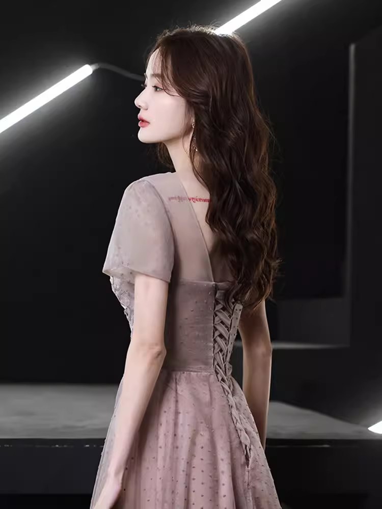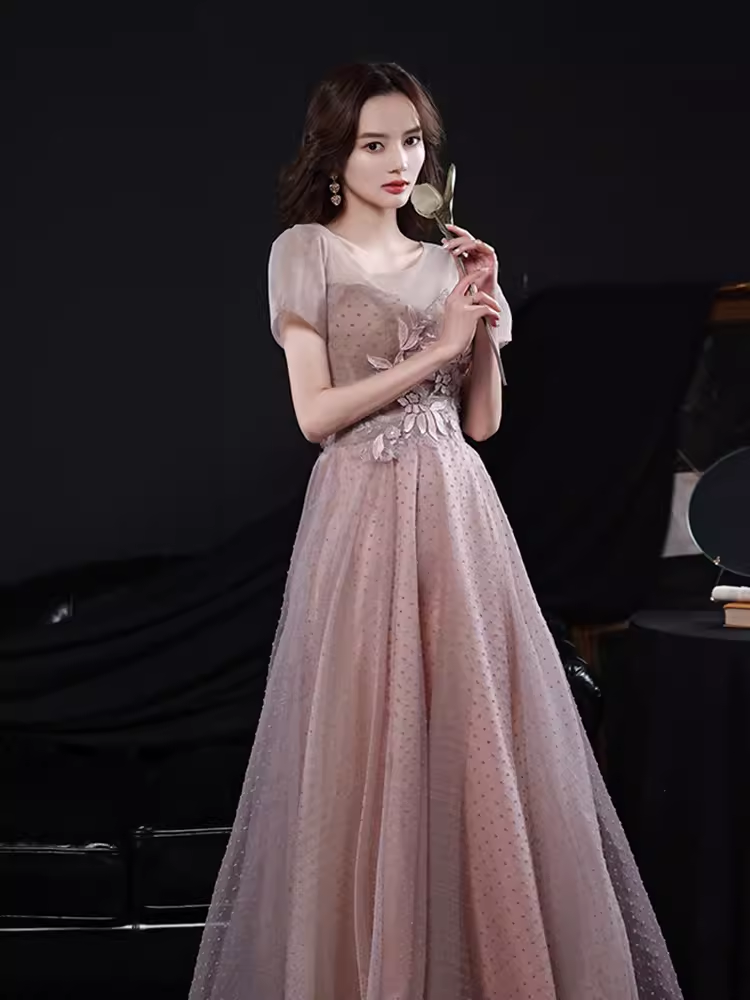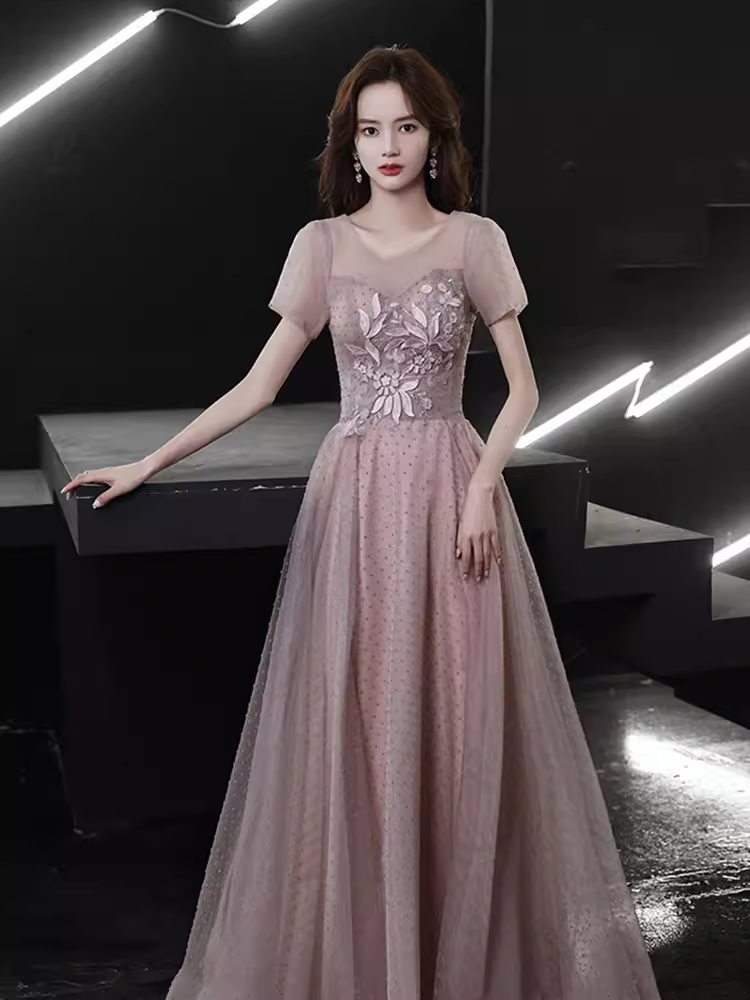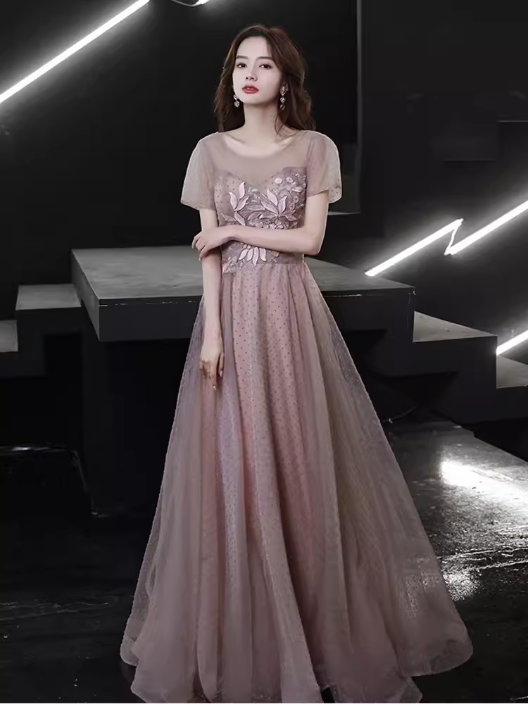 Simple A line Short Sleeves Pink Long Prom Dress HZ1024
