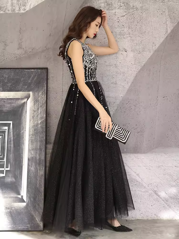 Simple A line V Neckline Black Beads Long Prom Dress HZ1024