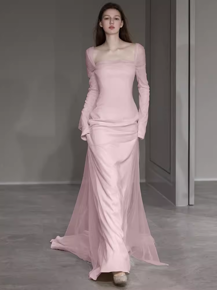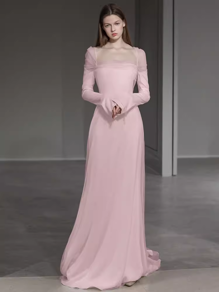 Simple Mermaid Long Sleeves Pink Long Prom Dresses HZ1024