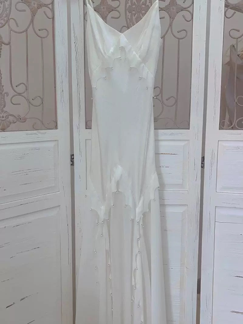 Simple Sheath Spaghetti Straps Ivory Long Prom Dress Formal Dresses With Pearls HZ1024