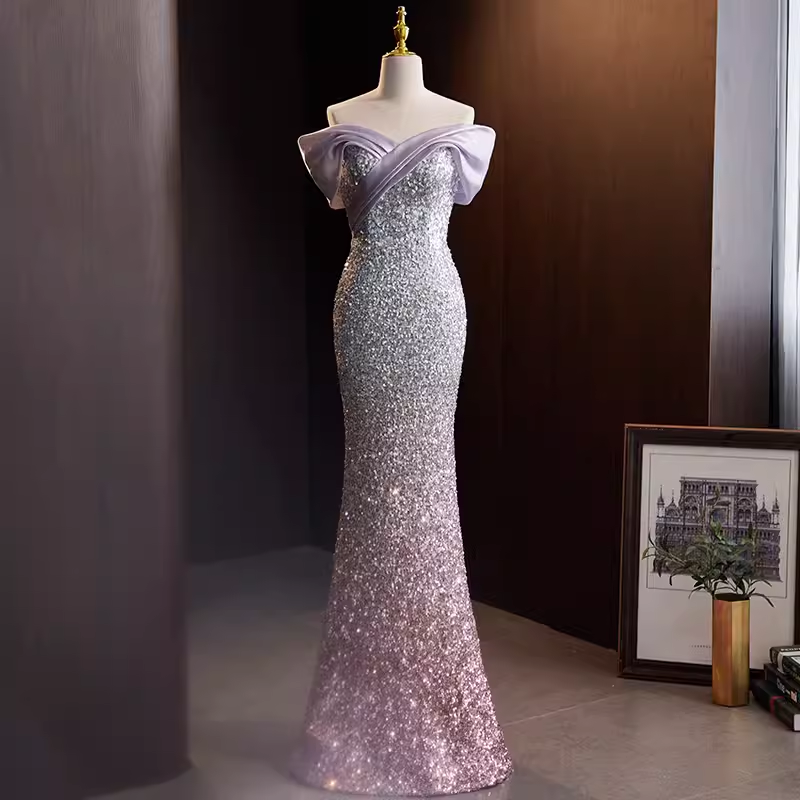 Sparkly Mermaid Off The Shoulder Sequin Lilac Long Prom Dresses HZ1024