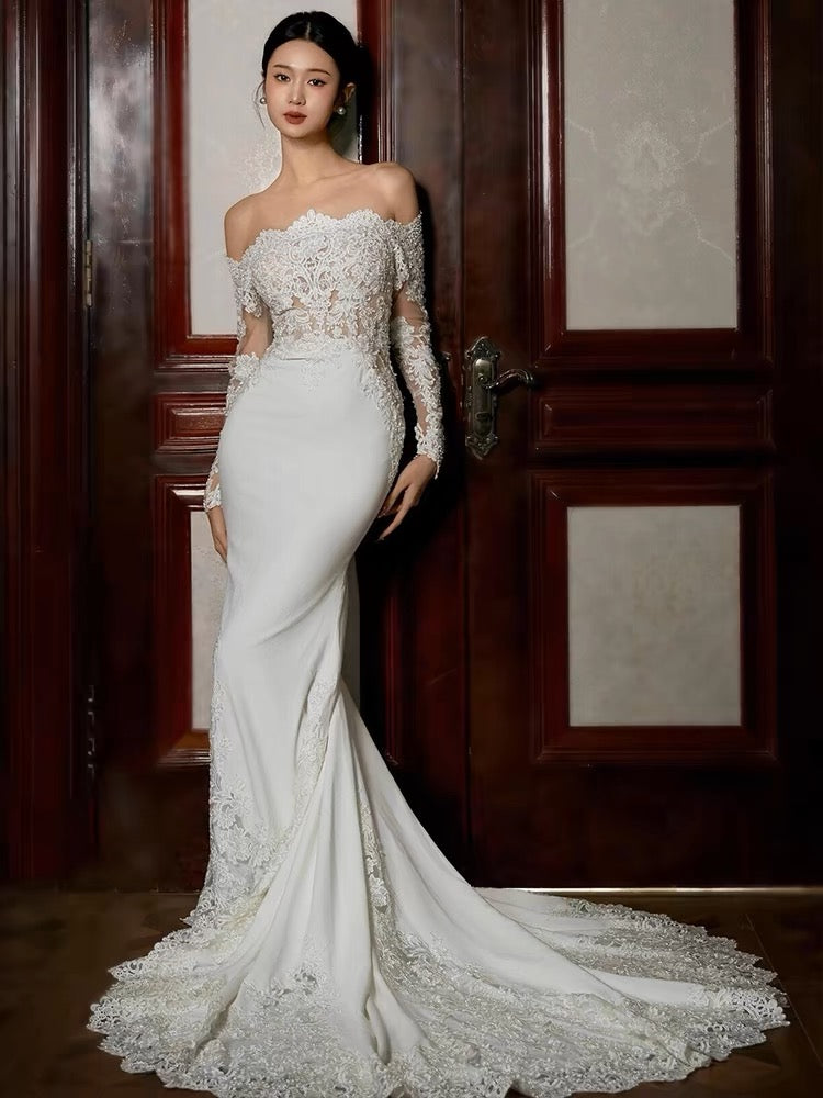 Unique Mermaid Off The Shoulder Lace Long Sleeves White Wedding Dresses HZ1024