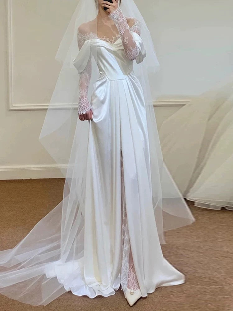 Unique Sheath Off The Shoulder Satin Long Sleeves White Slit Wedding Dresses HZ1024