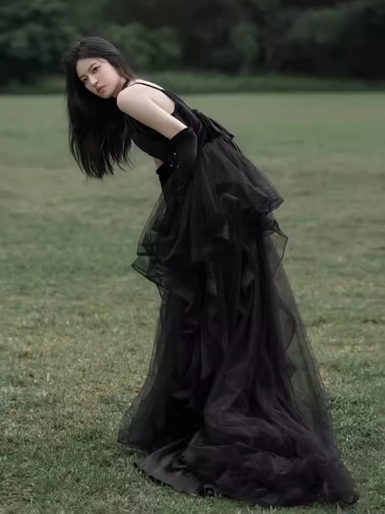 Vintage A line Straps Black Tulle Velvet Long Prom Dress HZ1024
