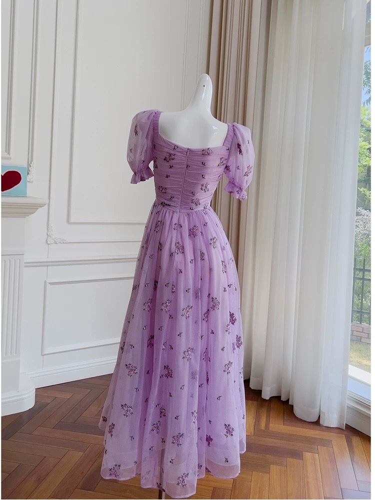Vintage A line V Neckline Short Sleeves Lilac Tulle Flowers Prom Dress Evening Dresses HZ1024
