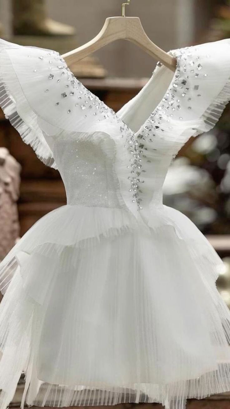 Vintage A line V Neckline White Tulle Birthday Outfits Homecoming Dress HZ1024