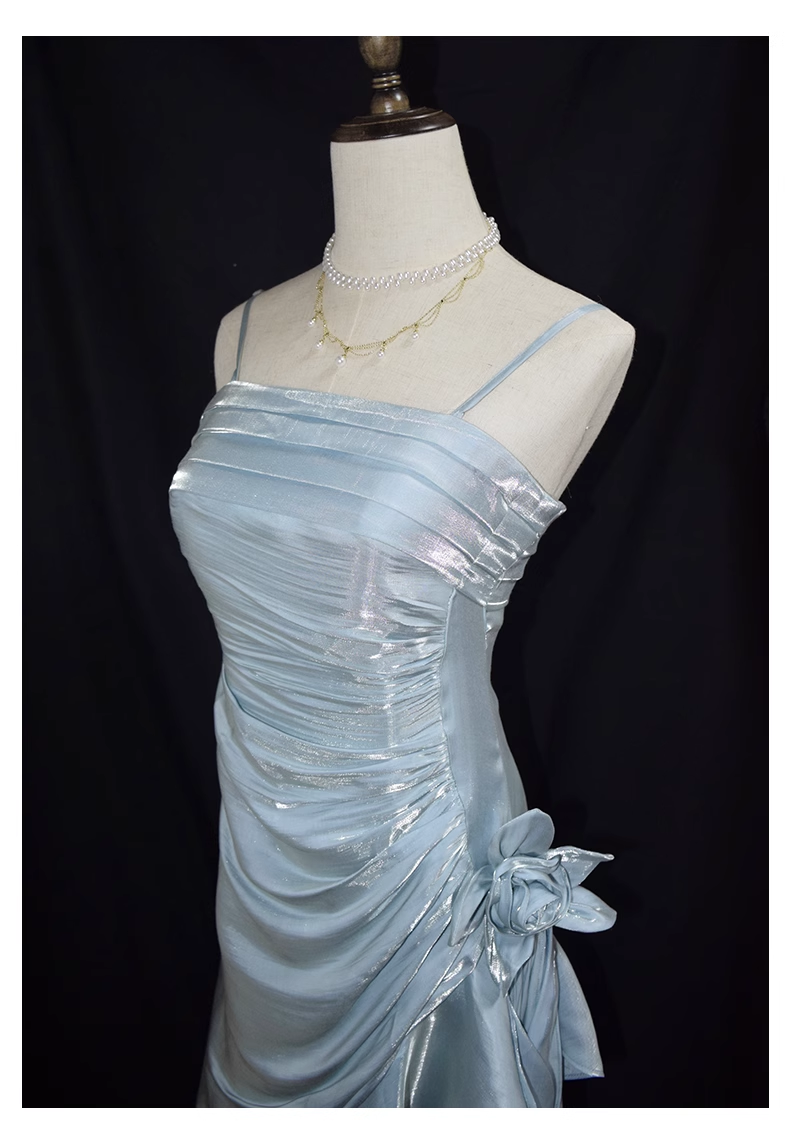 Vintage High Low Straps Ruffles Light Sky Blue Prom Dresses HZ1024