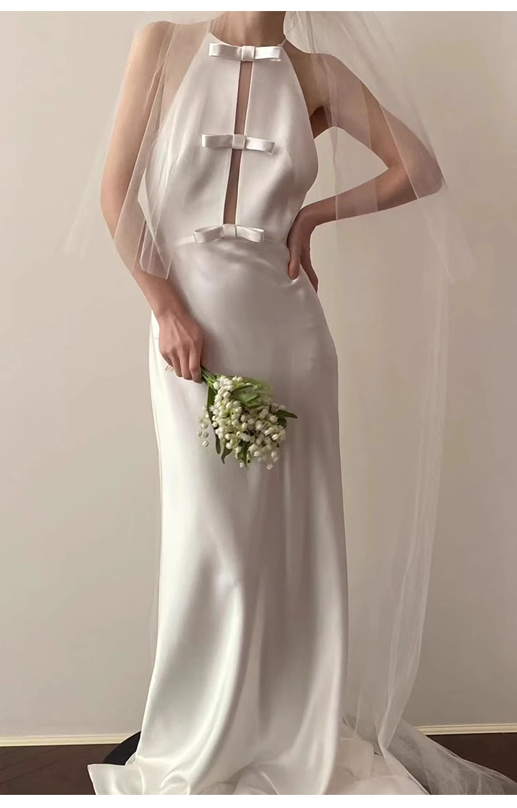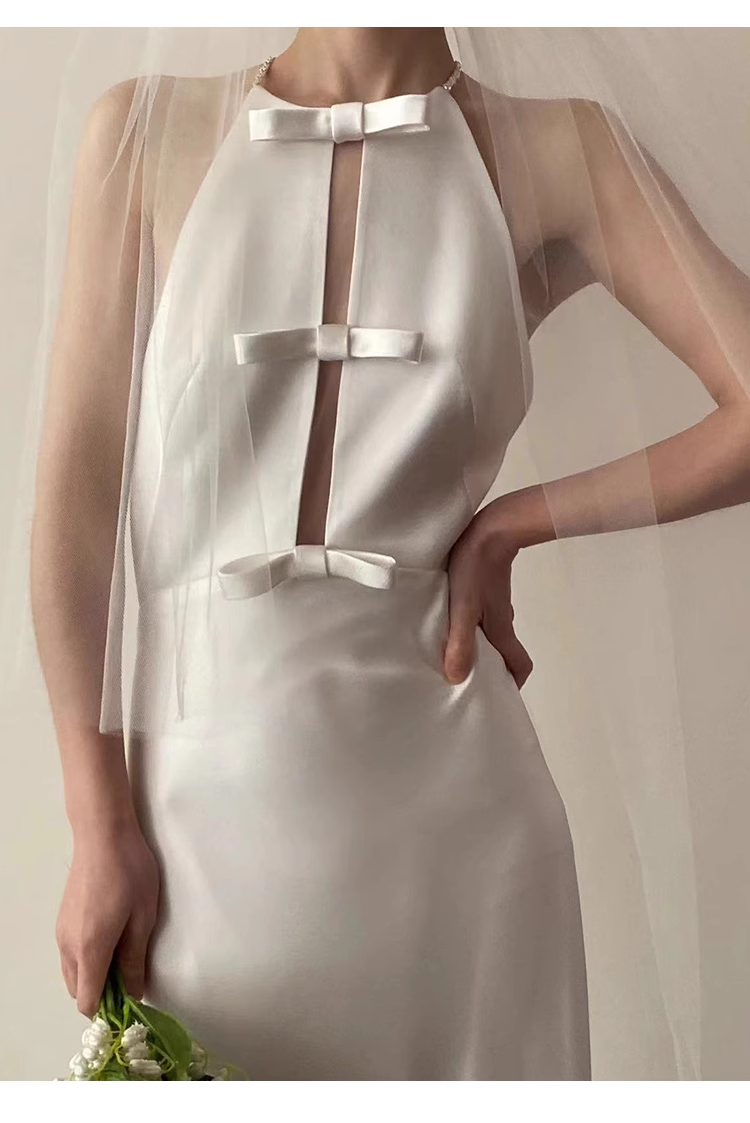 Vintage Sheath Scoop Neckline Satin White Wedding Dress With Bowknot HZ1024