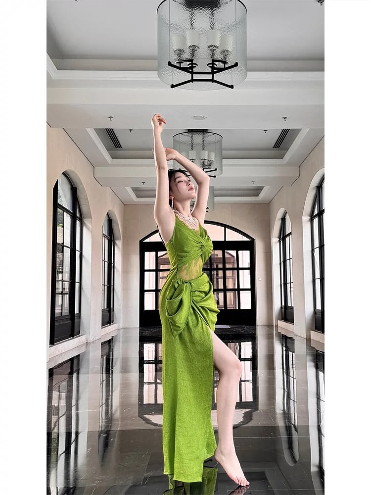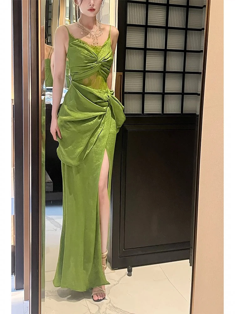 Vintage Sheath Spaghetti Straps Sleeveless Green Slit Prom Dresses Evening Dress HZ1024